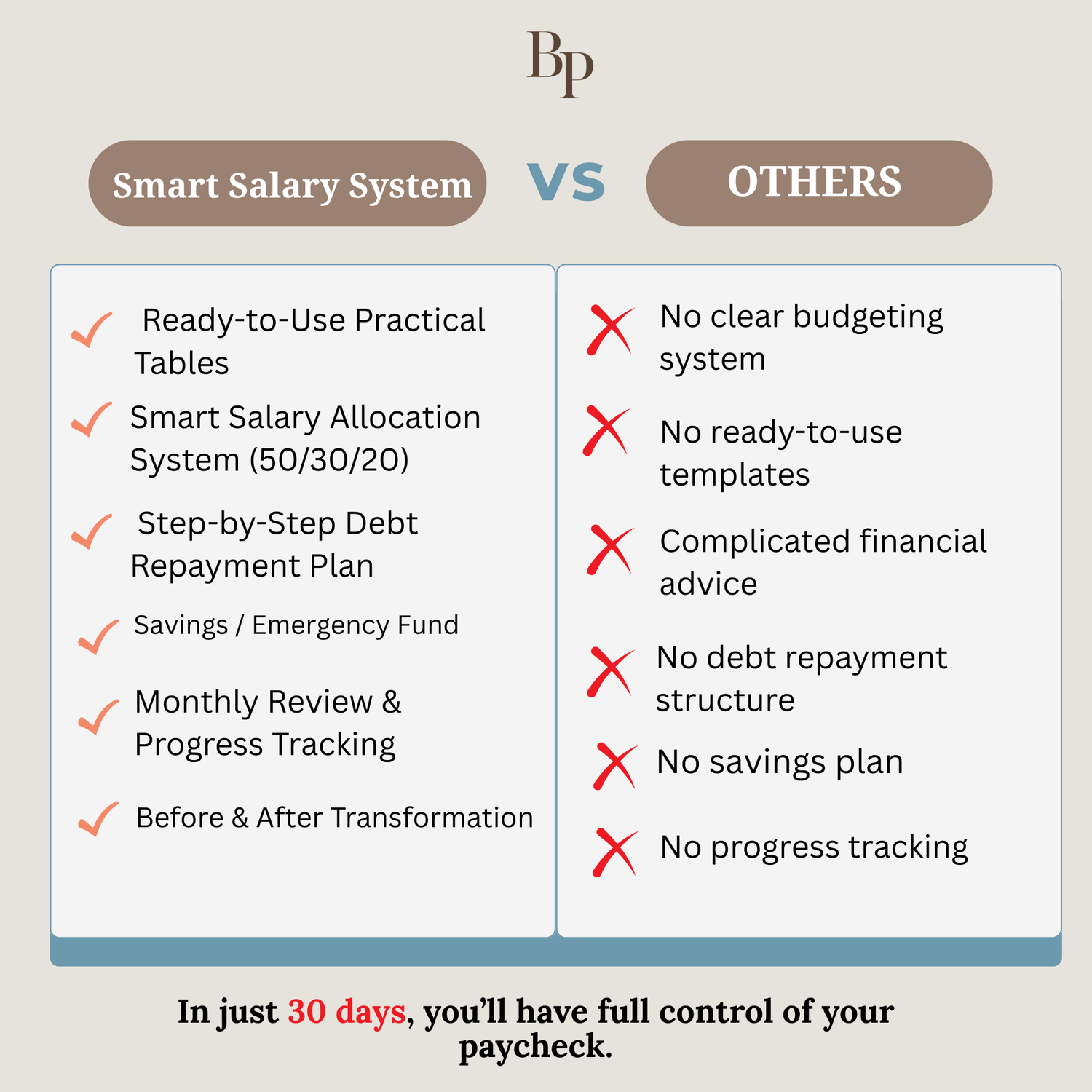 After using this system, you’ll experience full control over your salary, easily track every expense, reduce financial stress, and build a reliable savings and emergency fund. You’ll manage debts smartly, review your progress monthly, and gain complete clarity and confidence in your finances. No more paycheck-to-paycheck living—your money will finally work for you, giving you real financial stability and independence.